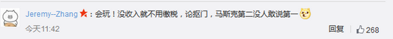 网友@Jeremy--Zhang表示 : 会玩!没收入就不用缴税,论抠门,马斯克第二没人敢说第一。