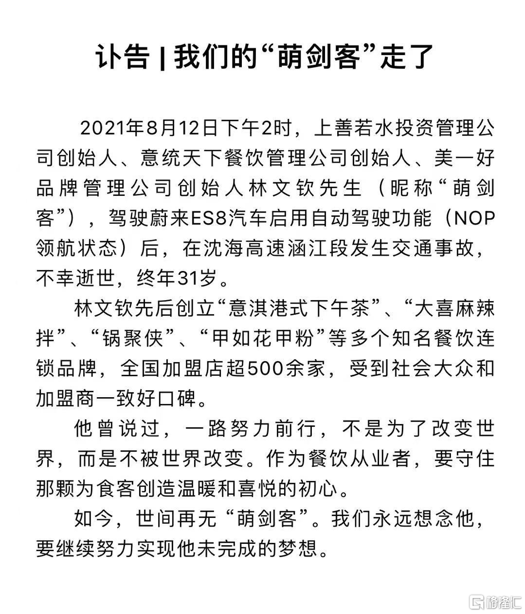 一个认证为“美一好”的个人公众号发布讣告称, 2021年8月12日下午2时,上善若水投资管理公司创始人、意统天下餐饮管理公司创始人、美一好品牌管理公司创始人林文钦(昵称“萌剑客”),驾驶蔚来ES8汽车启用自动驾驶功能(NOP领航状态)后,在沈海高速涵江段发生交通事故,不幸逝世,终年31岁。