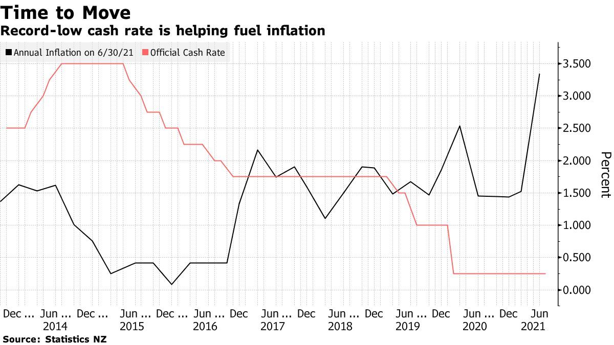 据报道,由于未受Delta变种病毒影响的强劲经济复苏显示出过热迹象,新西兰将于本周加息,成为亚太地区首个开始政策正常化的发达经济体。