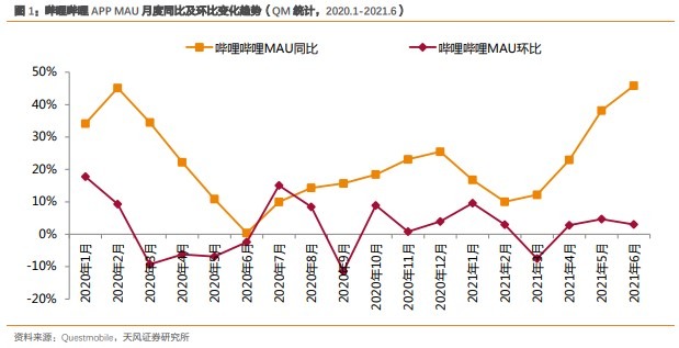 最后,可能最值得关注的数据是B站的月活用户数量。天风证券根据QM数据预测,B站21年第二季度的MAU同比增长35%,环比增长3%,DAU同比增长26%,环比增长2%。