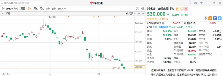不过,最近B站的跌势可以用“一泻千里”四个字来形容。自6月28日最高点1052港元以来,到8月17日发稿,接近腰斩,报530港元。