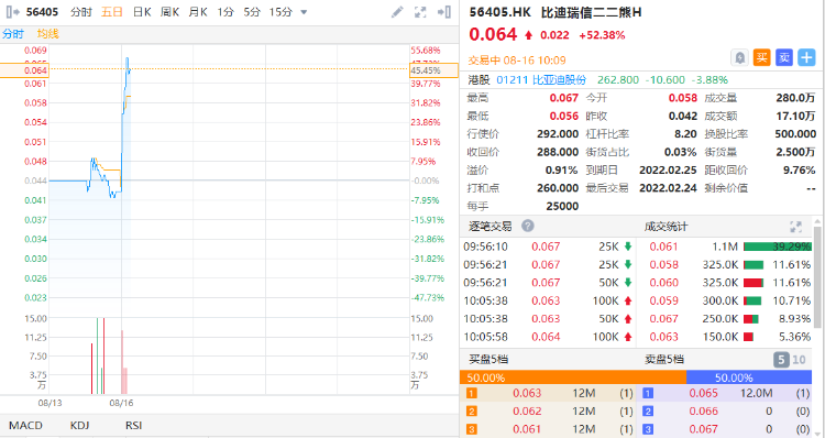 相关涡轮方面,截至发稿,比迪瑞信二二熊H涨52.38%,其行使价为292.00.00港元,到期日为2022年2月25日,溢价0.91%。