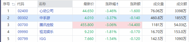 华盛资讯8月16日消息,手游股盘中集体下挫,截至发稿,心动公司下跌3.46%;中手游下跌3.37%;腾讯控股下跌3.06%;祖龙娱乐、IGG跌超1%。