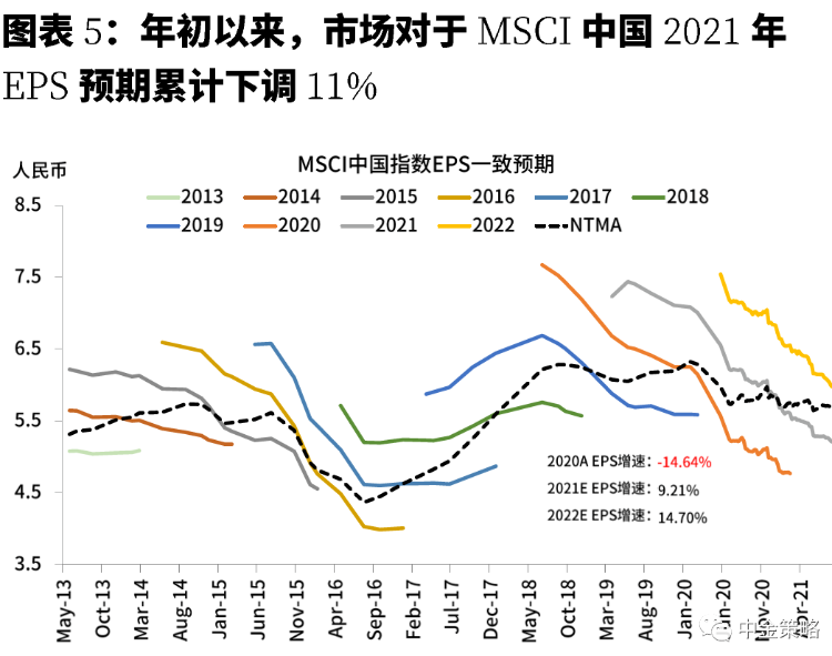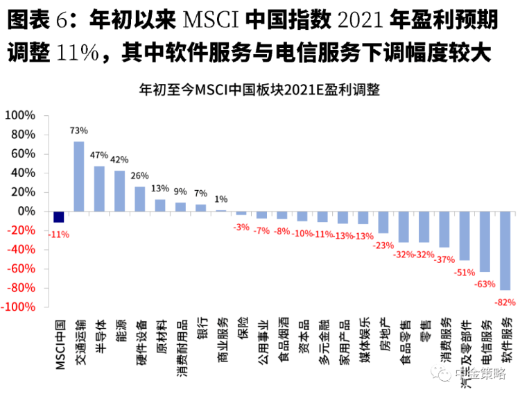 年初以来,市场对于MSCI中国2021年EPS预期累计下调11%,其中板块之间的盈利调整分化明显,交通运输、半导体、能源板块盈利上调超30%,而软件服务、电信服务、汽车及零部件、消费服务、零售等盈利大幅下调超30%。