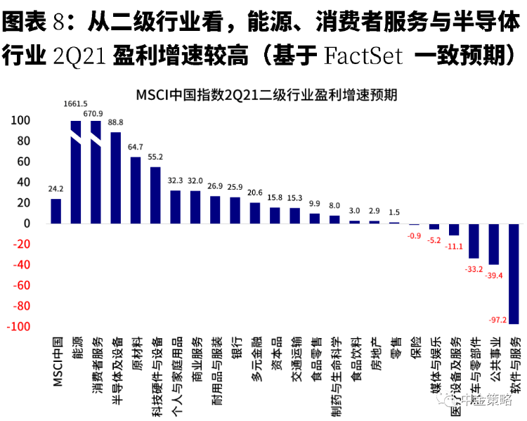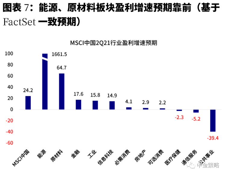 整体看,FactSet汇总的一致预期显示,MSCI中国二季度盈利增速有望达到24.2%,较一季度的37.9%放缓。板块层面,当前FactSet预期显示,能源、消费者服务、半导体、原材料与科技硬件有望实现50%以上的盈利增速,而软件与服务、公共事业、汽车、医疗设备与服务、媒体娱乐等板块盈利增速为负。相比一季度,食品零售、商业服务、等疫情受损较多的板块盈利情况改善较为明显,相比而言,医疗设备与服务、媒体娱乐、汽车等盈利增速明显回落。