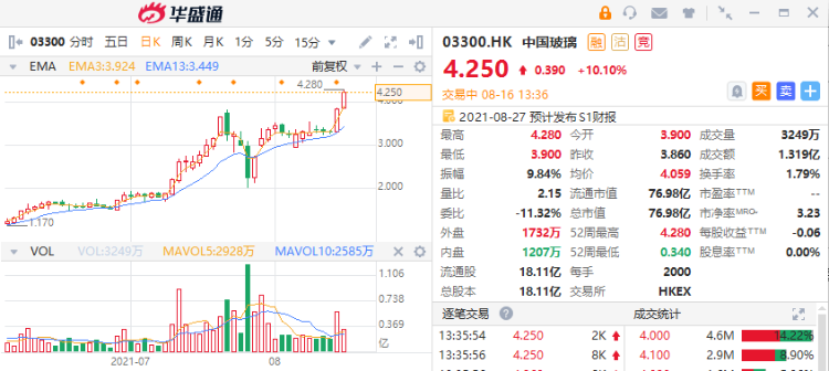 中国玻璃午后延续涨势,盘中最高见4.25港元刷新52周新高,逼近历史高点4.7港元。该股现涨幅10.1%,成交额达1.319亿港元,最新总市值76.98亿港元,三个月累计涨幅逾300%。