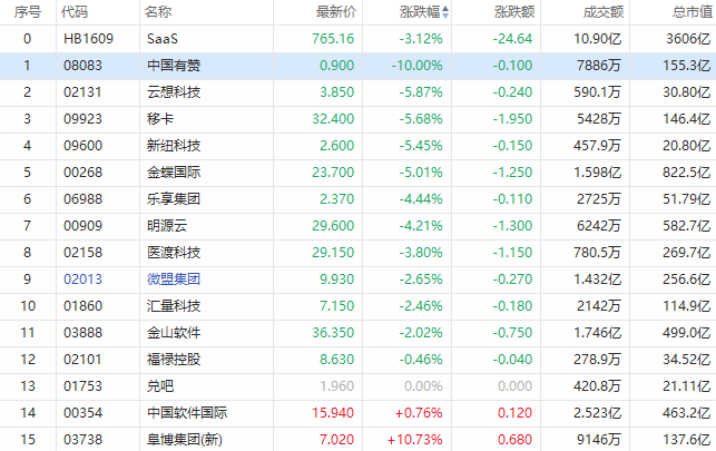 云想科技跌近6%;移卡跌5.68%;新纽科技、金蝶国际等跌逾5%;明源云跌4.21%、微盟跌2.65%。
