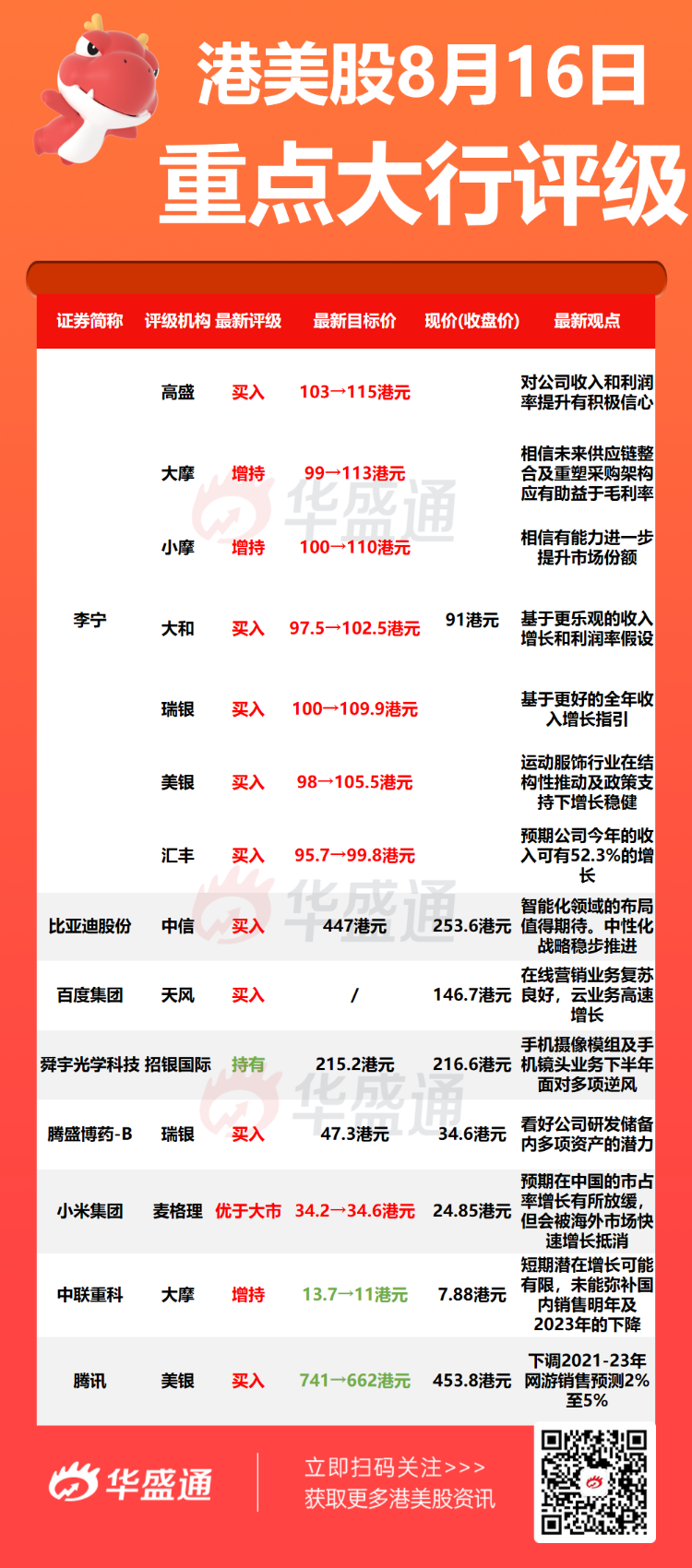 高盛发布研究报告称,维持李宁“买入”评级,目标价由103港元升12%至115港元,预计2020-26年销售的年复合增长21%,收入为31%,净利润率在2026年将达到18.5%,将2021-26年的盈利预测上调11%-22%,以考虑上半年的盈利改善及下半年前景稳健,以及对公司收入和利润率提升有积极信心。
