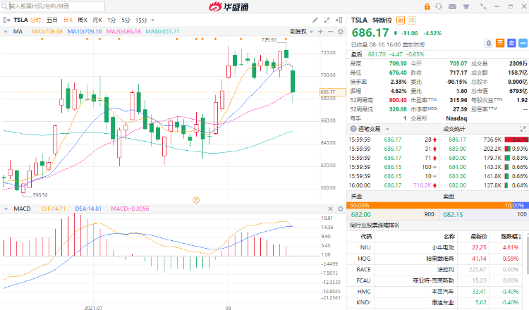 16日晚间,美股开盘之后,特斯拉直线跳水,收盘跌4.32%,股价现报686.17美元,市值一夜蒸发近2000亿人民币。