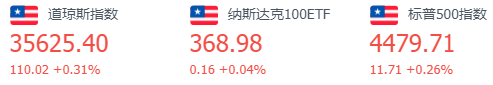 道指涨110.02点,或0.31%,报35625.40点;纳指跌29.14点,或0.20%,报14793.76点;标普500指数涨11.71点,或0.26%,报4479.71点。