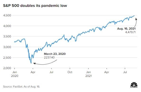 标普500指数已经从2020年3月23日收盘低谷2237.40点反弹100%。CNBC对标准普尔500全球公司数据的分析显示,股市花了354个交易日达到了这样的高度,是二战以来最快的牛市翻倍。