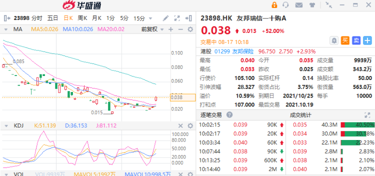 相关涡轮方面,友邦瑞信—十购A $23898.HK 涨52%,其行使价为105.1港元,到期日为2021年10月25日,引伸波幅达28.33,溢价10.59%。