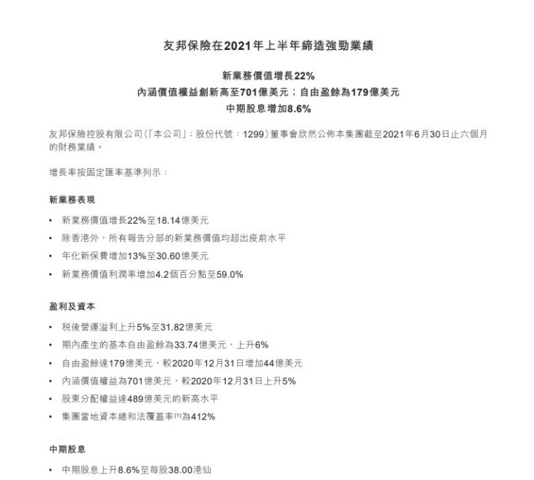 友邦今日早间发公告称,公司上半年总加权保费收入185.1亿美元,上半年净利润32.5亿美元;上半年新业务价值增长22%,市场预估增长21%。