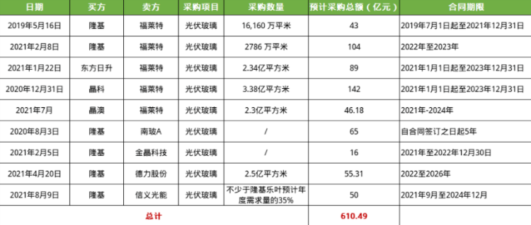 8月初福莱特发布公告称,公司与晶澳科技签署了关于销售光伏玻璃的《战略合作协议》,协议规定晶澳科技及其指定的控股公司预计向福莱特及其指定的全资控股公司在2021年-2024年三年内采购约2.3亿平方米组件用光伏压延玻璃。同时,今年以来福莱特先后与东方日升、隆基签订协议,分别售出34GW(约2.34亿平方米)组件用光伏压延玻璃、46GW光伏组件用光伏玻璃,订单额分别为89.09亿元、117亿元。