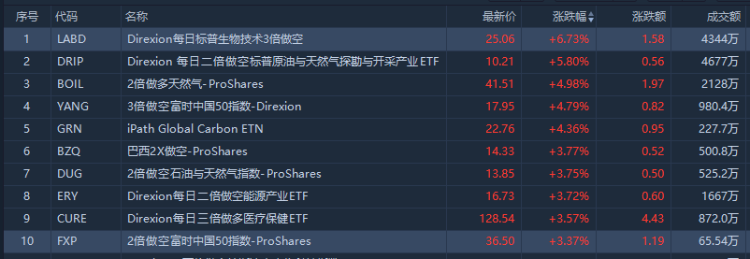从ETF涨幅榜来看,涨幅居前的ETF集中在做空生物技术、原油方面,其中每日标普生物技术3倍做空 $LABD 涨6.73%,成交4344万美元;每日二倍做空标普原油与天然气勘探与开采产业ETF $DRIP 涨5.80%,成交4677万美元。