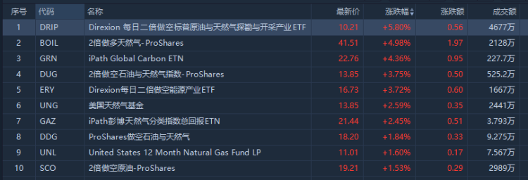从ETF涨幅榜来看,涨幅居前的是每日二倍做空标普原油与天然气勘探与开采产业ETF $DRIP ,收涨5.80%,成交4677万美元;2倍做多天然气 $BOIL 涨4.98%,成交2128万美元。