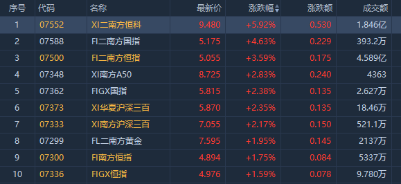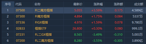 二倍做空南方恒科 $07552.HK 收涨5.92%,成交1.846亿万港元;二倍看空南方国指收涨4.63%,成交393.2万港元。
