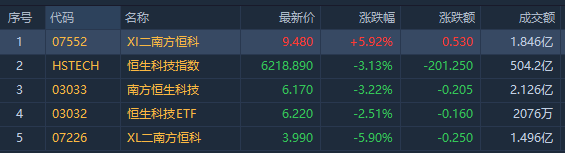 南方两倍做多恒科 $07226.HK 跌5.90%,成交额约1.496亿港元;