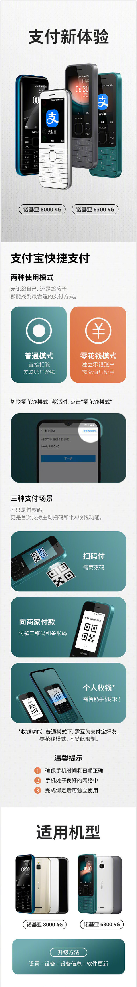 诺基亚官方表示,目前两款手机已支持支付宝扫码支付功能,系统更新后就能使用。两款手机支持“主动扫码”以及“出示付款码”两种付款方式,可根据不同的使用场景自由选择。目前诺基亚手机提供两种模式,分别为可以直接扣除关联账户余额的“普通模式”以及独立零钱账户的“零花钱模式”,用户可以根据自身的场景,选择到适合自己的支付方式。