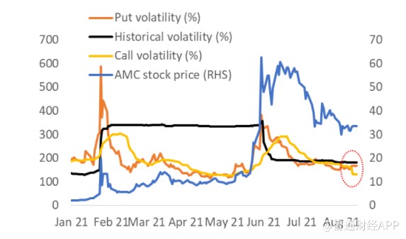 由于AMC的基本面与重新开放直接相关,且受新冠影响,该股的看跌期权和看涨期权的波动性与日常情况的变化密切相关。当美国日新增新冠确诊病例上升时,AMC的看跌期权波动率上升,当确诊病例下降时,看涨期权波动率上升。