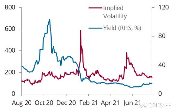 当公司难以为资产负债表融资时,期权隐含波动率和债券收益率可能同时上升或下降。以AMC为例,其历史期权波动率有所下降,最长期限债券收益率也有所下降。因此,在第一季度股价飙升时,违约概率从25%降至11%。