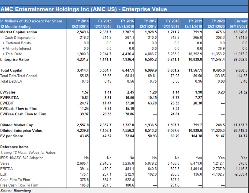 AMC的估值被债务改善提振,但理由很充分。估值模型对此持怀疑态度,并预测该股的价值约为每股10.25美元,仅比当前价格低了一小部分。值得注意的是,与2019年的水平相比,AMC总债务略有增加,而权益价值却大幅增加。尽管该股票具有显著的“炒作价值”,一个估值模型估计其股票价值为33.75美元/股(当前价格的95%),如下图所示的其他模型表明,该股的价值可能为53.75美元/股(275.22亿美元/ 5.13亿股流通股)。