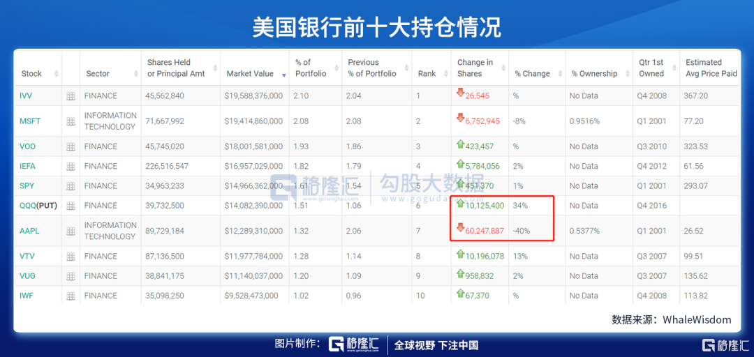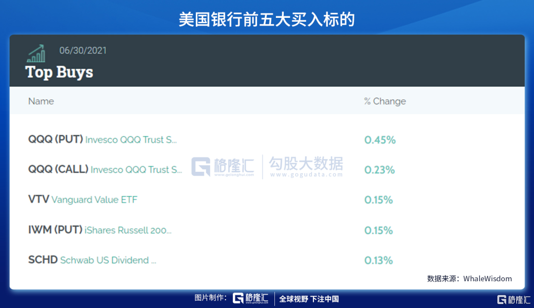 从持仓比例变化来看,美国银行Q2前五大买入标的分别是:QQQ(PUT)(纳指100ETF看跌期权)、QQQ(CALL)(纳指100ET看涨期权)、VTV(价值股ETF-Vanguard)、IWM(PUT)(罗素2000指数ETF看跌期权)和SCHD(红利股ETF-Schwab)。