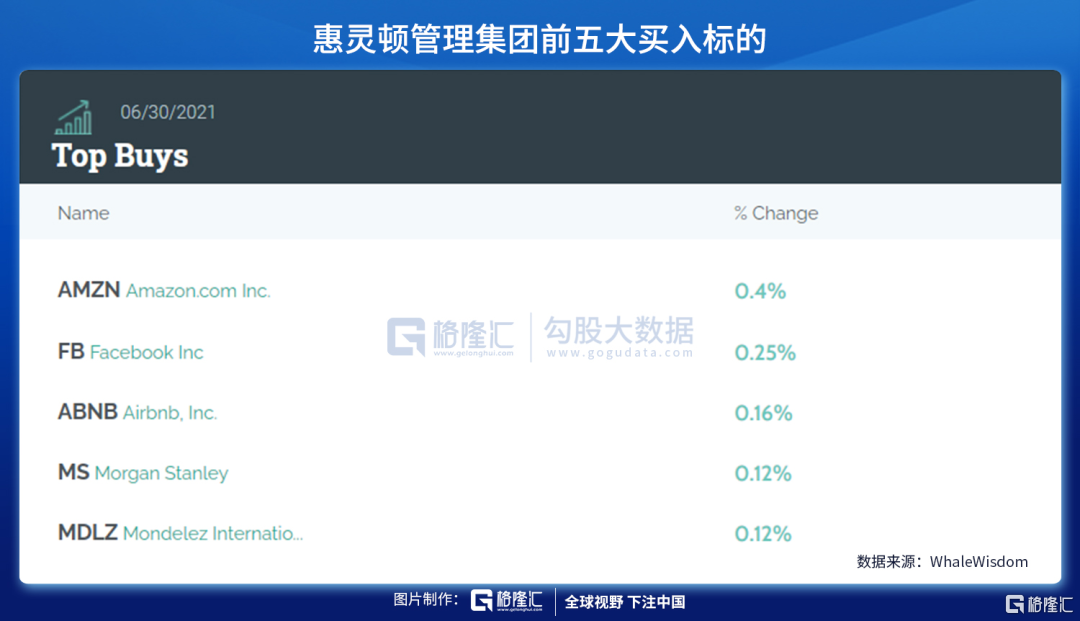 从持仓比例变化来看,惠灵顿管理集团Q2前五大买入标的分别是:AMZN(亚马逊)、FB(脸书)、ABNB(爱彼迎)、MS(摩根士丹利)和MDLZ(亿滋)。
