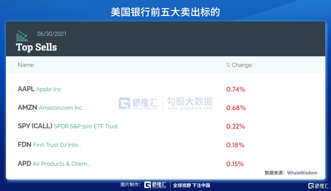 前五大卖出标的分别是:AAPL(苹果)、AMZN(亚马逊)、SPY(CALL)(标普500指数ETF-SPDR看涨期权)、FDN(互联网ETF-First Trust)及APD(空气化工Air Products & Chemicals Inc)。