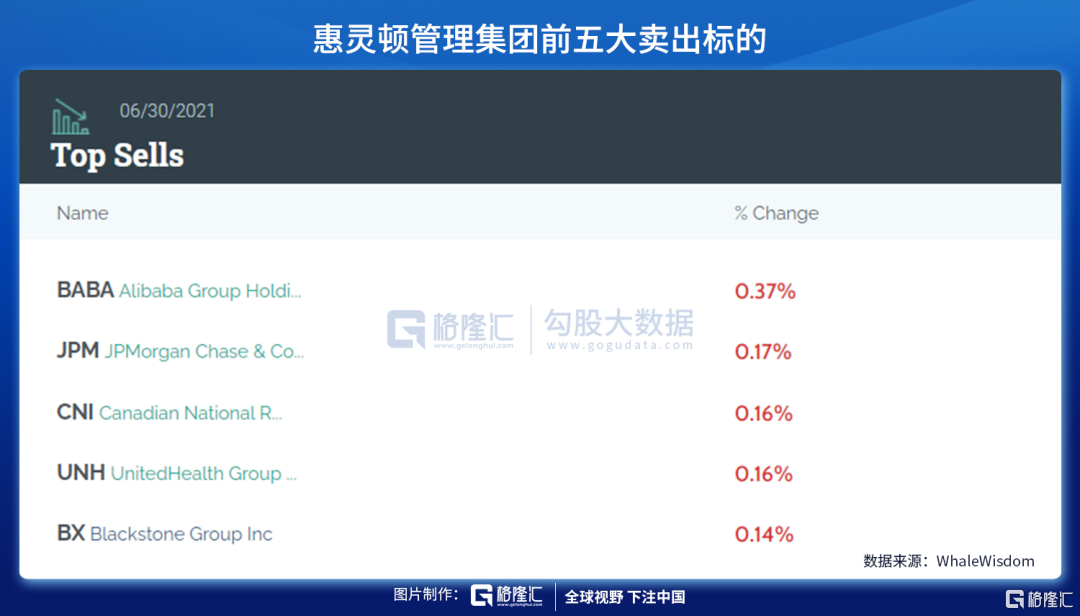 前五大卖出标的分别是:BABA(阿里巴巴)、JPM(摩根大通)、CNI(加拿大国家铁路)、UNH(联合健康)及BX(黑石)。