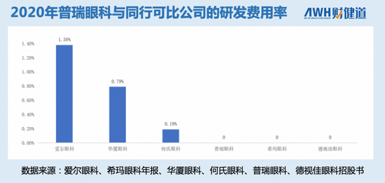 据普瑞眼科的招股书显示,其三年报告期的研发费用均为0。虽然如此,在同行间却也不显得太突出。已上市的爱尔眼科2020年的研发费用率为1.38%。冲击IPO的何氏眼科为0.19%、华厦眼科0.79%,光正眼科0.06%,在香港上市的两支股票:希玛眼科和德视佳却也没有在财报里披露任何研发费用。眼科医疗行业内的研发费用率平均竟不足1%。