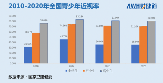 2018年,中国的近视患者已达6亿。根据国家卫健委的最新数据,2020年中国一半以上的未成年人近视,其中小学生近视比例为35.6%,初中生为71.1%,高中生达到了80.5%。中国的青少年近视率已多年位居世界第一。