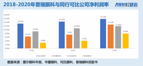 质疑并不是空穴来风,根据招股书显示,普瑞眼科三年报告期内的平均毛利率为42.73%,与同行可比公司相当,然而其净利润却是同行垫底,连爱尔眼科的一半都不到。