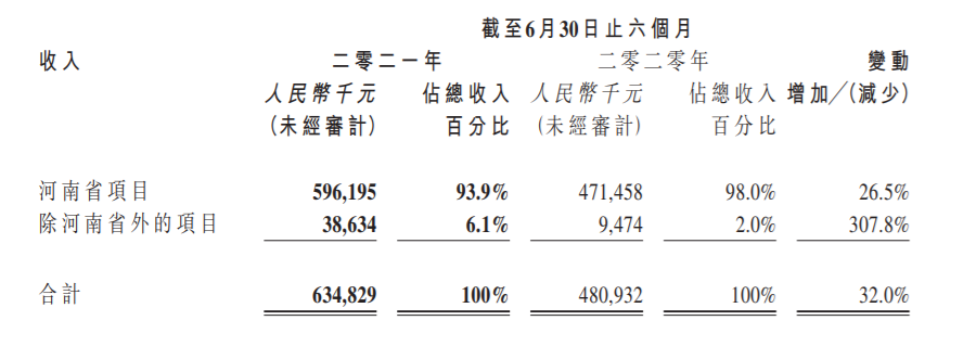 上半年,新签约的52个代建项目中,省外项目有9个,新增合约建筑面积92.86万平方米,占总新增合约面积的16%。期内,中原建业河南省内项目的收入为5.96亿元,增长26.5%;占比总收入93.9%,较去年同期下降4个百分点。而河南省外的项目营收则为3863.4万元,同比增长了307.8%。