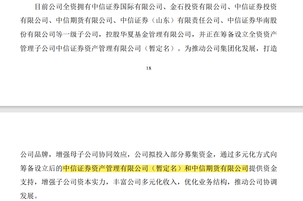不过,此次修订案中,中信证券称,拟投入部分募集资金,通过多元化方式向筹备设立后的中信证券资产管理有限公司(暂定名)和中信期货有限公司提供资金支持。