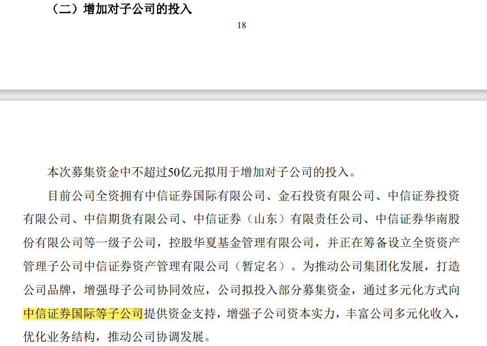 据2月预案,公司拟投入部分募集资金,通过多元化方式向中信证券国际等子公司提供资金支持,增强子公司资本实力。