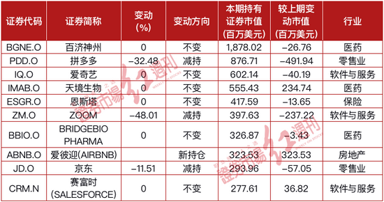 从前十大重仓股来看,高瓴二季度持仓整体变动不大。前十大重仓整体持仓市值约为60亿美元,占总持仓60%。其中,持仓生物科技公司百济神州18.7亿美元,仍是公司“第一重仓股”。(见表1)