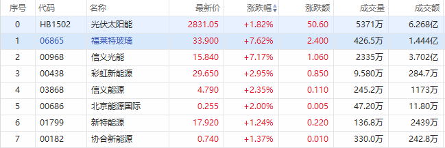 华盛资讯8月18日消息,光伏太阳能板块早盘走强,截至发稿,福莱特玻璃上涨7.62%;信义光能上涨7.17%;彩虹新能源上涨2.95%;信义能源上涨2.35%;新特能源、协和新能源涨超1%。