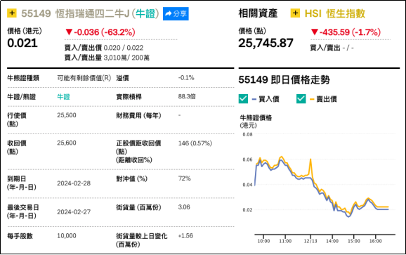 2、看错方向:恒指瑞通四二牛J(55149.HK),周二下跌63.2%。
