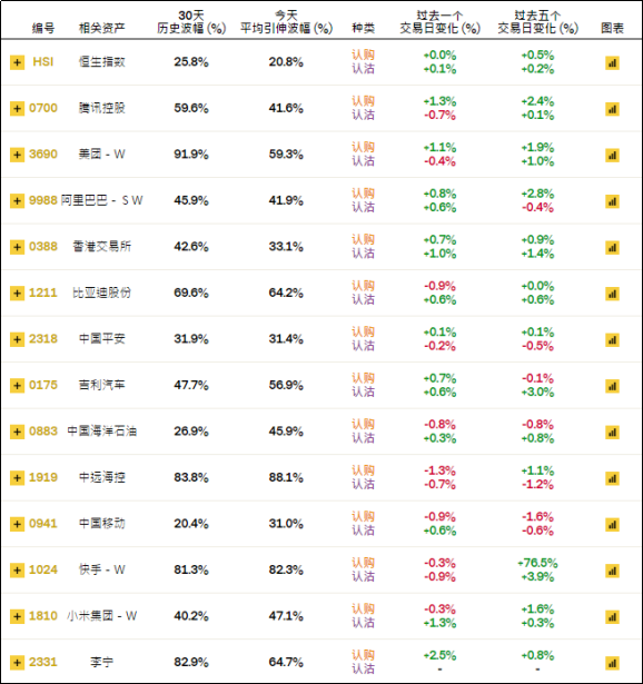 周二恒指相关权证的平均引伸波幅报约20.8%。个股方面,腾讯、美团、李宁等相关认购证的引伸波幅按日明显调升;港交、小米等相关认沽证的引伸波幅按日调增。