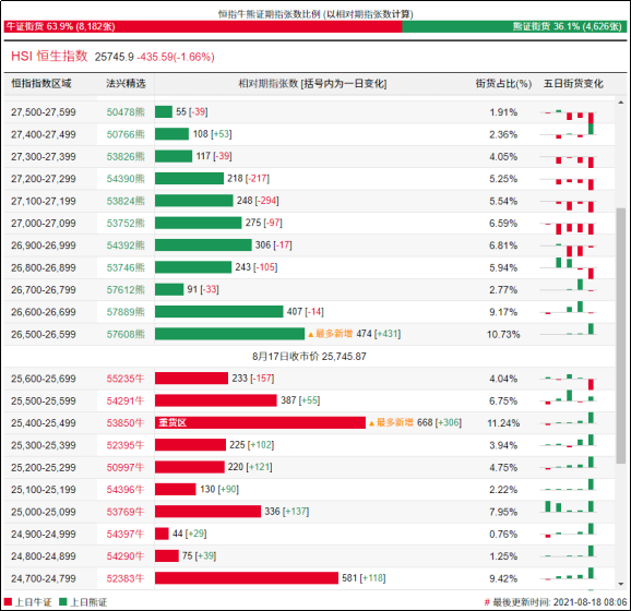 街货分布方面,周二,恒指牛证街货贴价区间主要在收回价25200点至25700点之间,累计相当约1733张期指合约;恒指熊证街货在收回价26500点至26700点,累计相当约1520张期指合约。