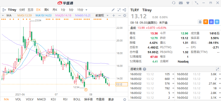 华盛资讯8月18日消息,今日美股盘前,Tilray(TLRY)盘前涨6.63%,消息面上,Tilray试图通过持股美国大麻药房MedMen来打进美国市场。