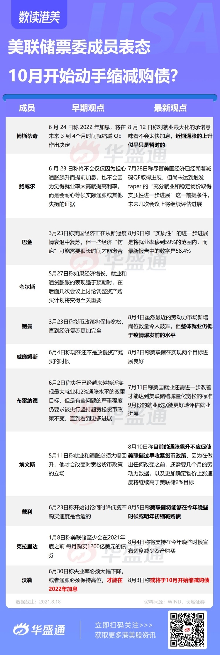 美联储理事沃勒等都公开呼吁10月宣布缩减购债规模。亚特兰大联储主席博斯蒂克支持在10月至12月的某个时间开始缩减购债规模。值得注意的是,以上这些美联储官员并不以“鹰”派著称。