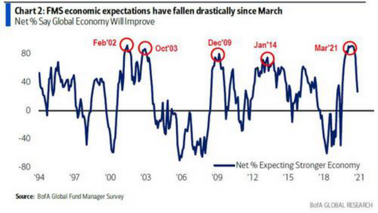 美国银行基金经理调查显示,随着对经济增长预期下降,市场整体信心已经崩溃。