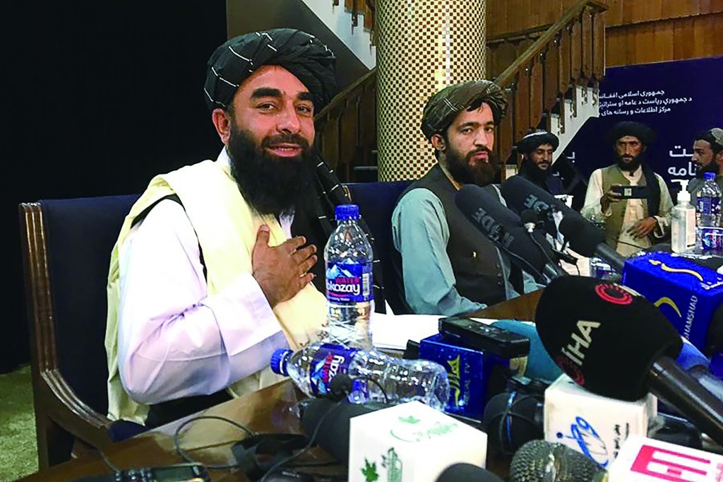 8月17日,塔利班发言人扎比乌拉·穆贾希德(左)在喀布尔举行首场记者会。