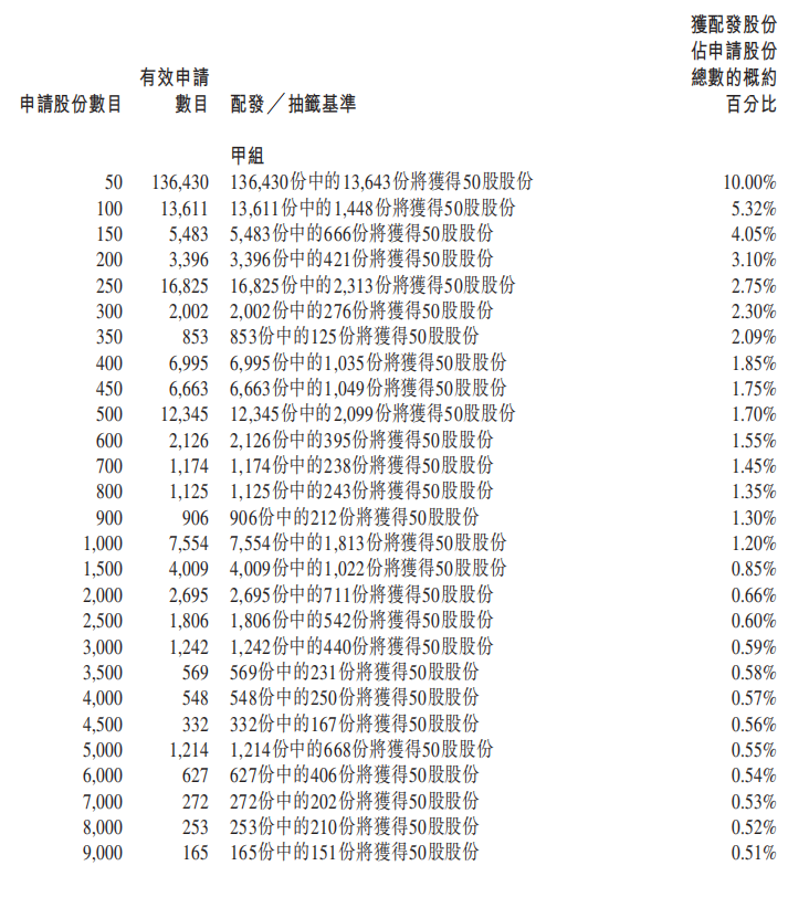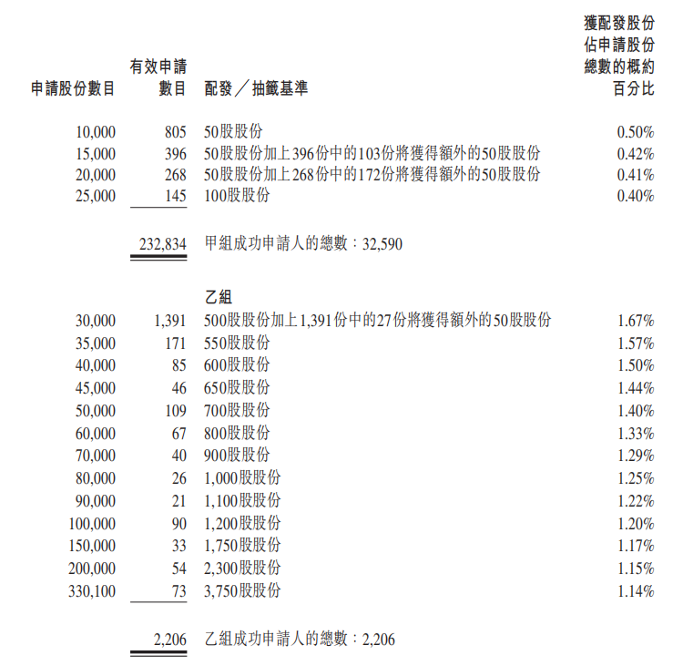 根据香港公开发售初步提呈发售的香港发售股份获非常大幅超额认购,超购332.14倍。已将264.08万股H 股由国际发售重新分配至香港公开发售。香港公开发售的H股最终数目为330.1万股H股,相当于根据全球发售初步可供认购的发售股份总数(任何超额配股权获行使前)约50%。