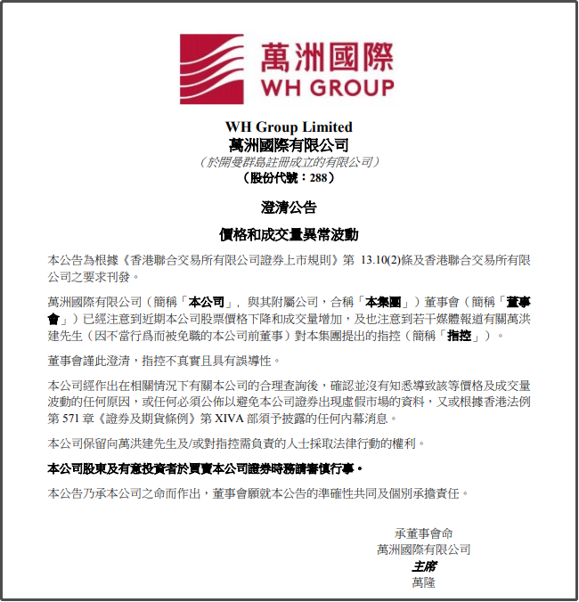 8月18日,万洲国际发布公告称,公司董事会已经注意到近期公司股票价格下降和成交量增加,也注意到若干媒体报道有关万洪建对集团提出的指控,董事会在此澄清,万洪建对集团提出的指控不真实且具有误导性。万洲国际保留向万洪建先生及/或对指控需负责的人士采取法律行动的权利。