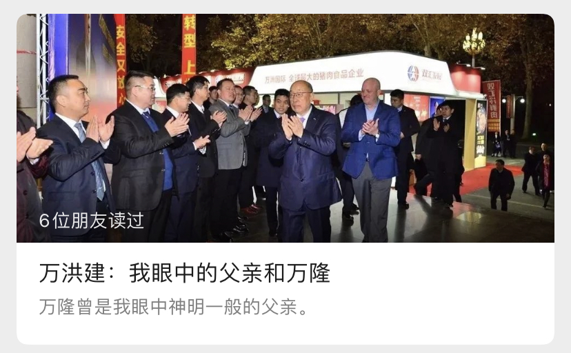 8月17日晚,公众号“新肉业”推送一篇文章,标题为《万洪建:我眼中的父亲和万隆》,而该文章的作者正是前不久被排出万洲国际的“废太子”万洪建本人。