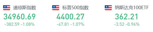 截至周三收盘,道指跌382.59点,或1.08%,报34960.69点;纳指跌130.27点,或0.89%,报14525.91点;标普500指数跌47.81点,或1.07%,报4400.27点。
