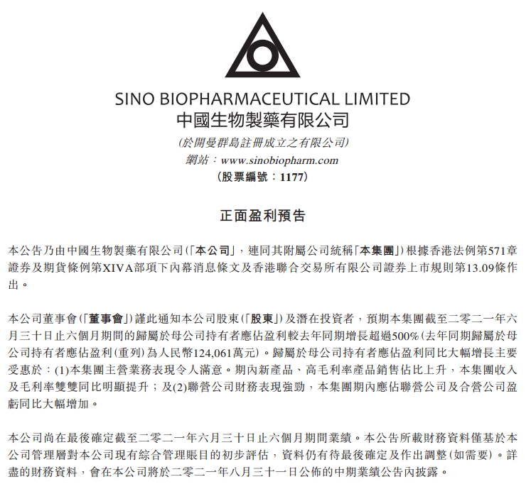 8月18日,中国生物制药 $01177.HK 公布2021年半年度业绩预增公告。公司表示,预期报告期内归属于母公司持有者应占盈利较去年同期增长超500%。截止发稿中国生物制药股价涨超4%。
